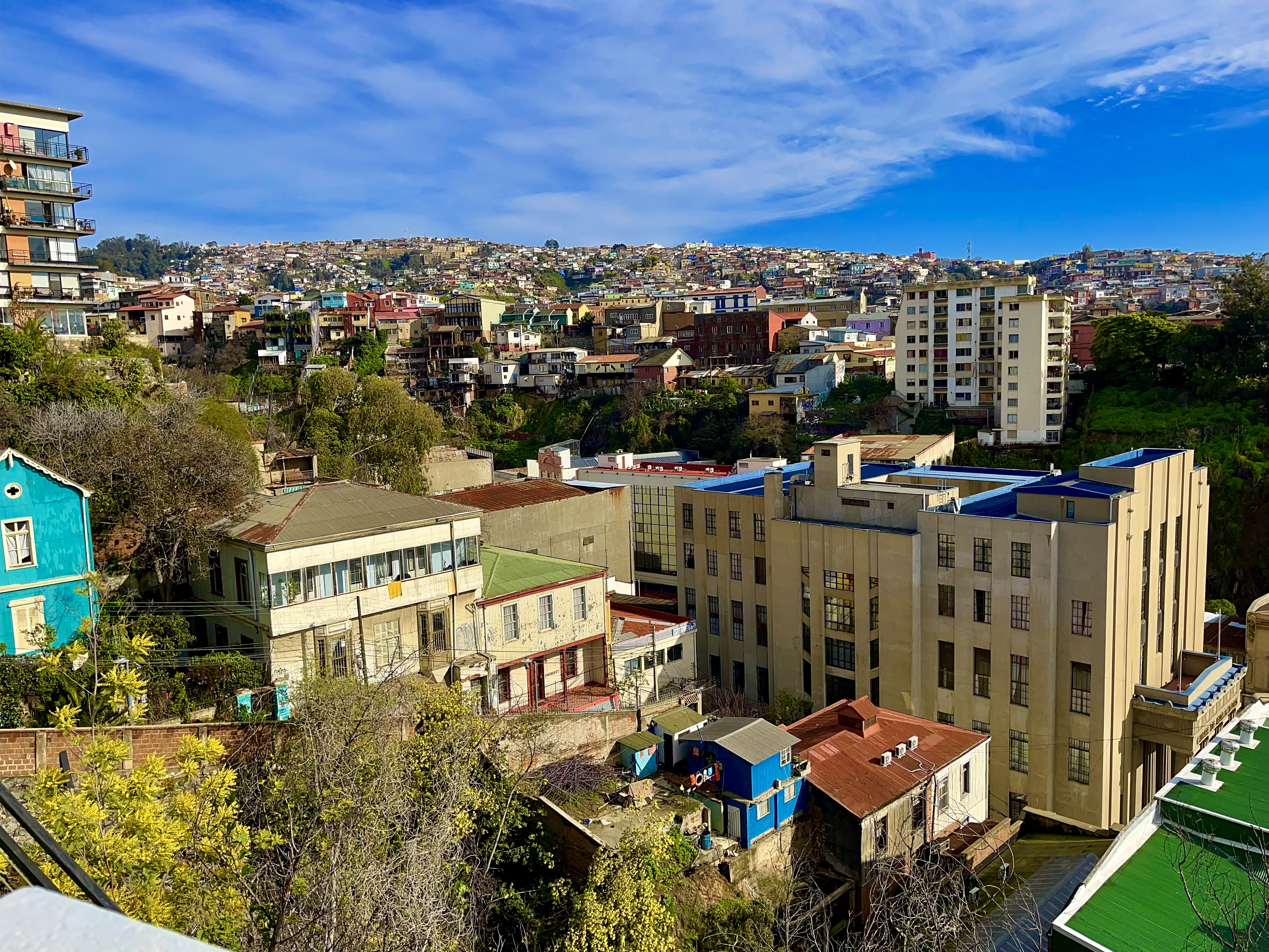 I was picked up at 8am for the roughly 75 min. drive from downtown Santiago by Freddy from Pride Tours for this day trip. I booked online just two days prior and there was no issue given it was low-season – the Chilean winter (June) – but I was still surprised it was just Freddy, me, and our driver for this daylong adventure. As we drove through the mountains and vineyards of the Casablanca Valley, we soon came to Valparaíso, nestled along the stunning Chilean coast, bathed in the winter sun. The city beckons from a distance with its enchanting blend of vibrant culture and breathtaking scenery. This coastal gem is renowned for its kaleidoscope of colorful houses that cascade down hillsides, creating an artistic canvas that is as charming as it is picturesque.