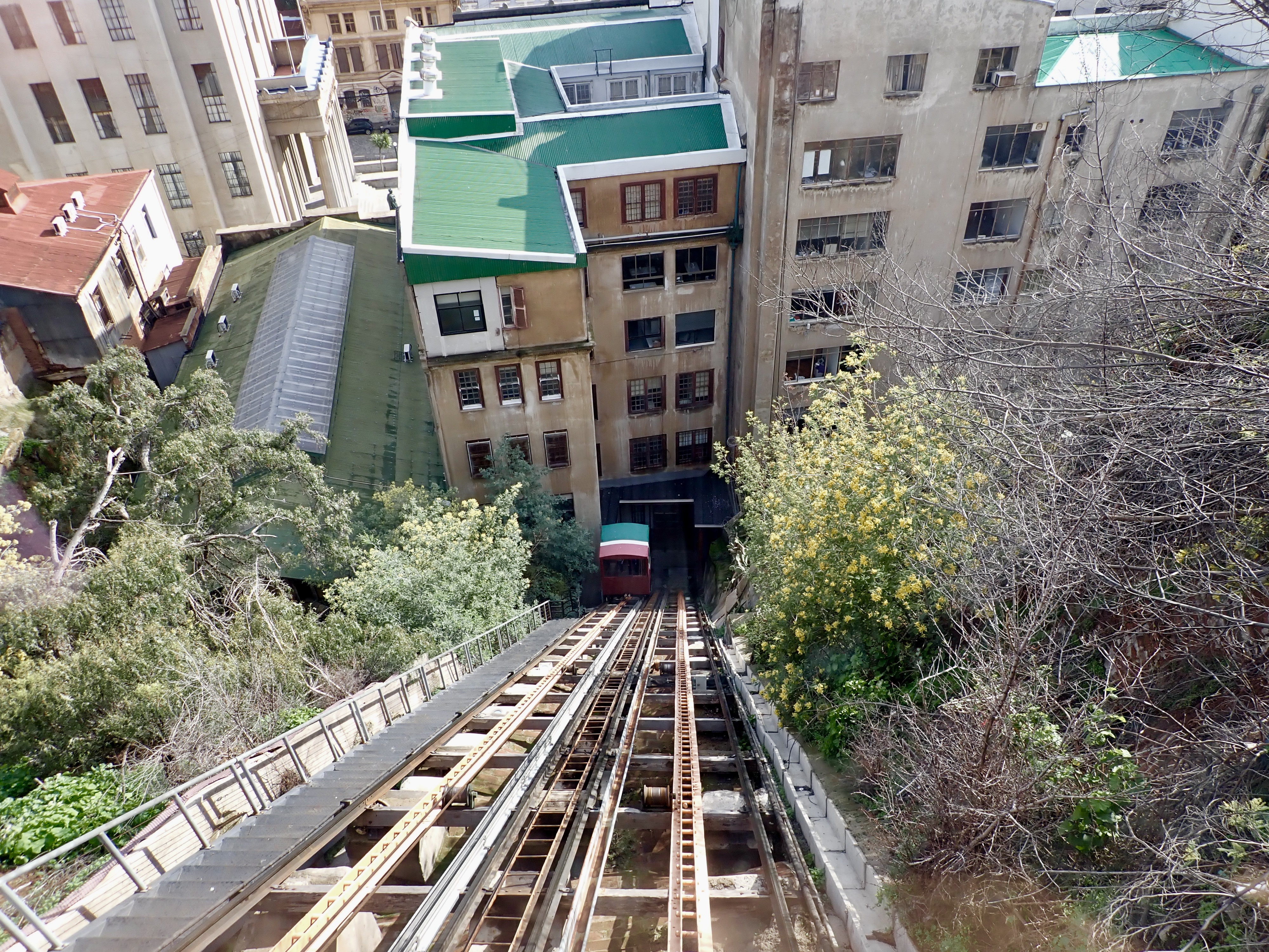 We left the van and driver near the port and wandered around Plaza Sotomayor, home to the building that houses the headquarters of the Chilean navy and one that houses the National Council of Culture and Arts. The quiet Plaza is anchored by a monument honouring Chilean sailors who died during the War of the Pacific in the late 1800s. And then we were off – not right or left or straight ahead – but upward! Valparaíso is a city of hills, winding streets, and corridors of stairs, and is home to 16 funiculars! Most were built in the early 1900s and while only 7 are active today, the others are undergoing restoration to bring them up-to-date and back to service. Our journey on the El Peral funicular took us up 39m (128ft) from the nearby Plaza Sotomayor, depositing us at Paseo Yugoslavo.