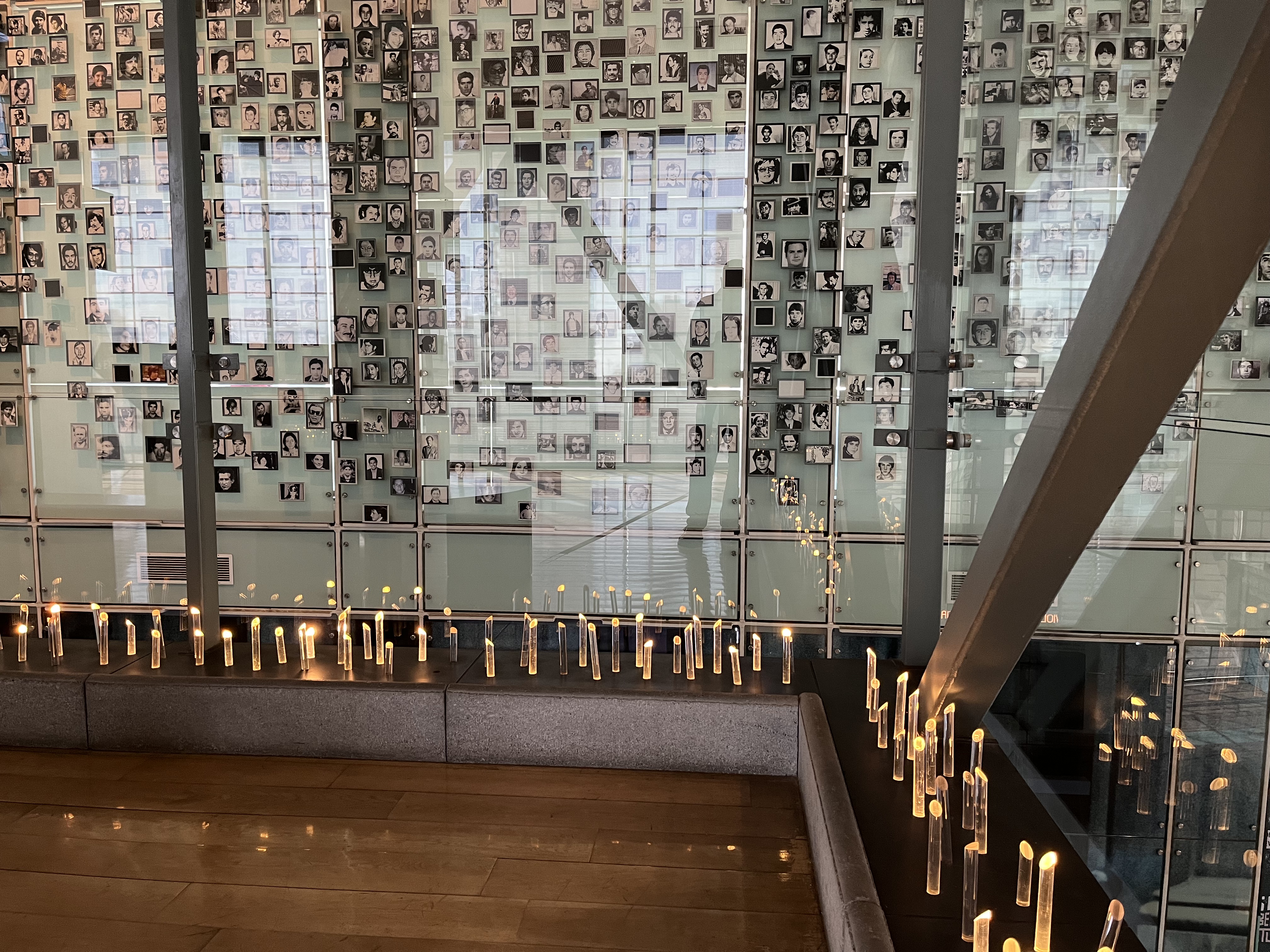 Adjacent to the portraits is a tranquil reflection area. Surrounded by illuminated shards of glass resembling candles, this space invites quiet contemplation while overlooking the wall of portraits. Candles, symbols of light, hope, and remembrance, serve as a poignant reminder of the imperative pursuit of justice and human rights. Here, I spent time reflecting on the exhibits, the museum itself, and the people who endured such grievous abuse. I also thought about the many amazing and welcoming people I encountered over my time in Chile, and how they and their families might have been impacted during the Pinochet regime.